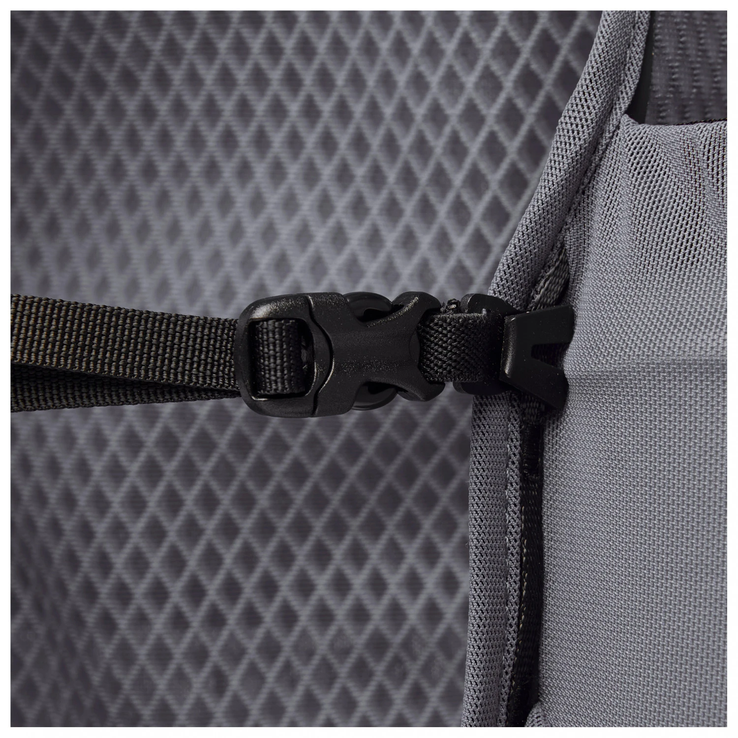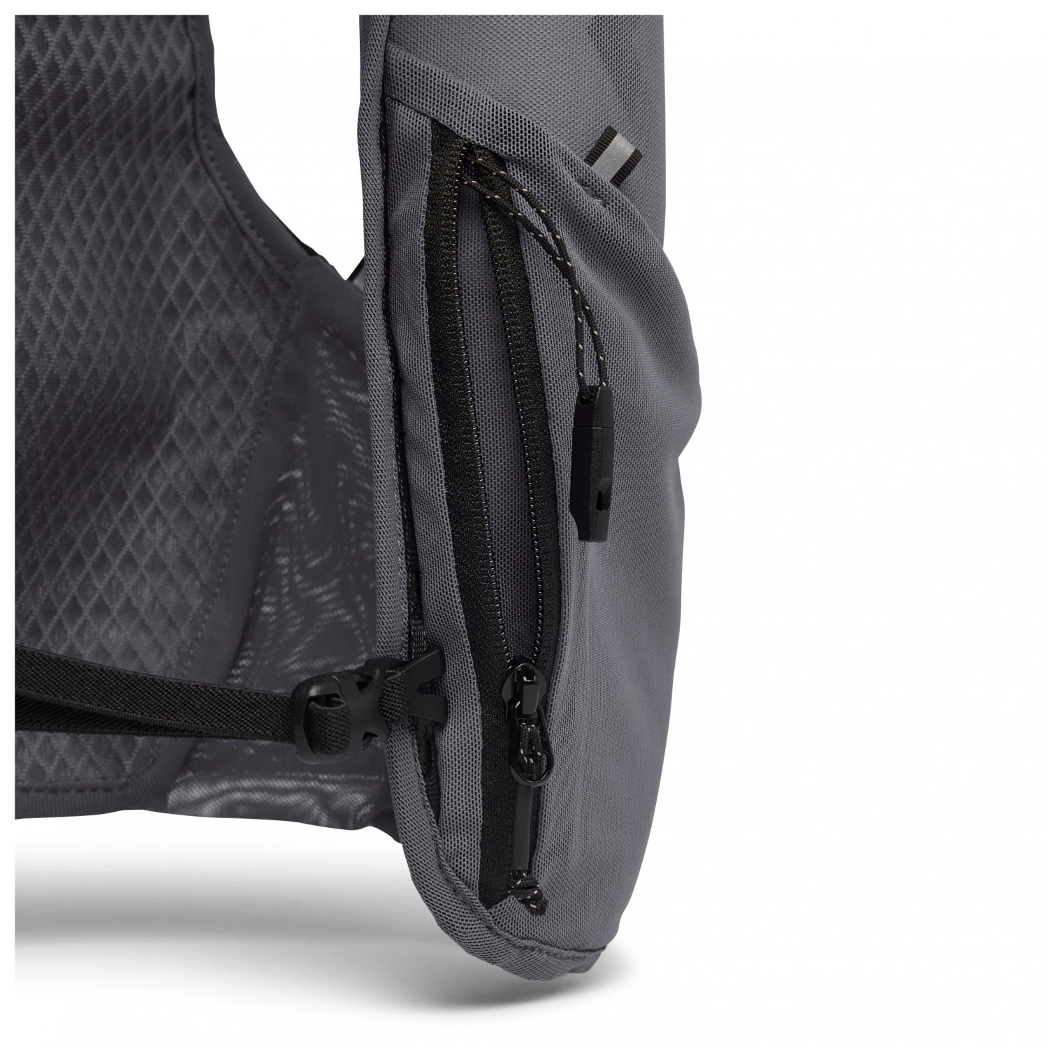 The pocket and attachment loop system is well thought out. For your folding poles, there are two attachments on the back that allow you to transport them diagonally. Also on the back is a zipped security pocket. The shoulder straps feature pockets for two soft flasks, which are included, and easy-access side pockets. In addition, you can find an extra zipped pocket in the left strap. With the help of the height-adjustable straps, you can optimally adjust the backpack’s vest-like fit to your torso.